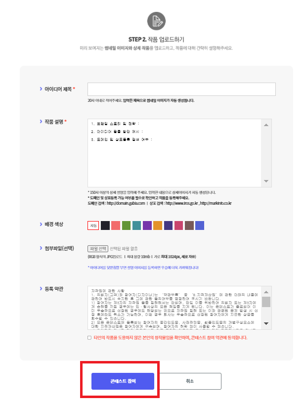 7. 작품에 대한 설명과 작품명을 입력하시고 컨테스트 참여 버튼을 누르면 끝~~