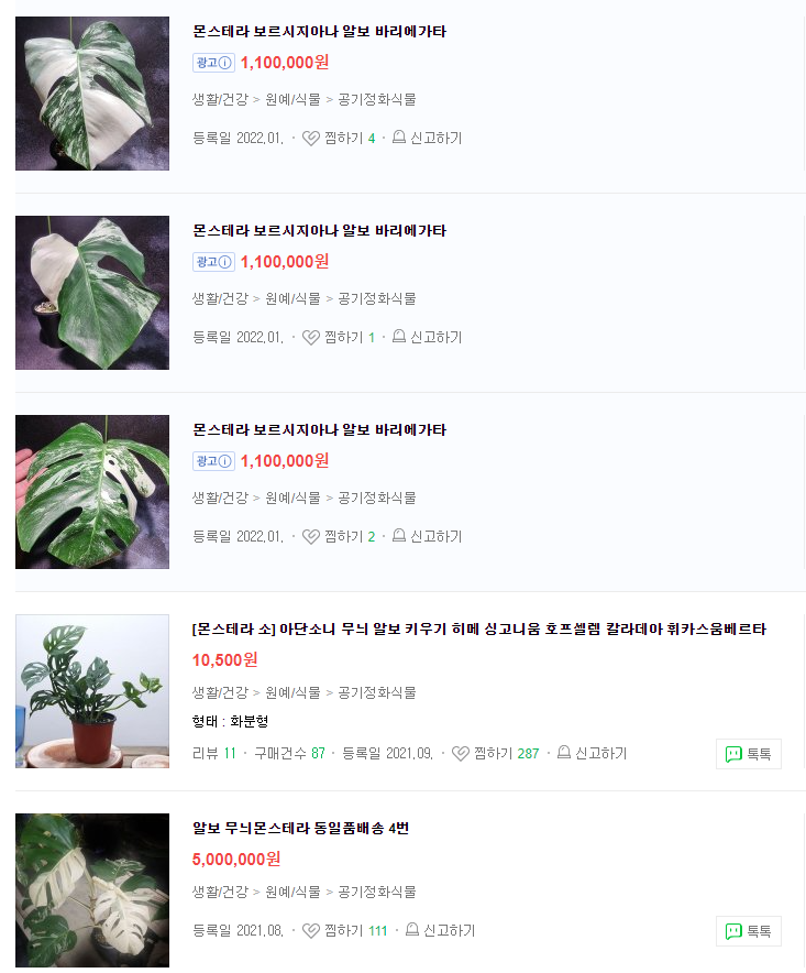 일반적으로 이파리 하나당 20~50만원정도의 가격을 이루고 있는 것 같습니다.