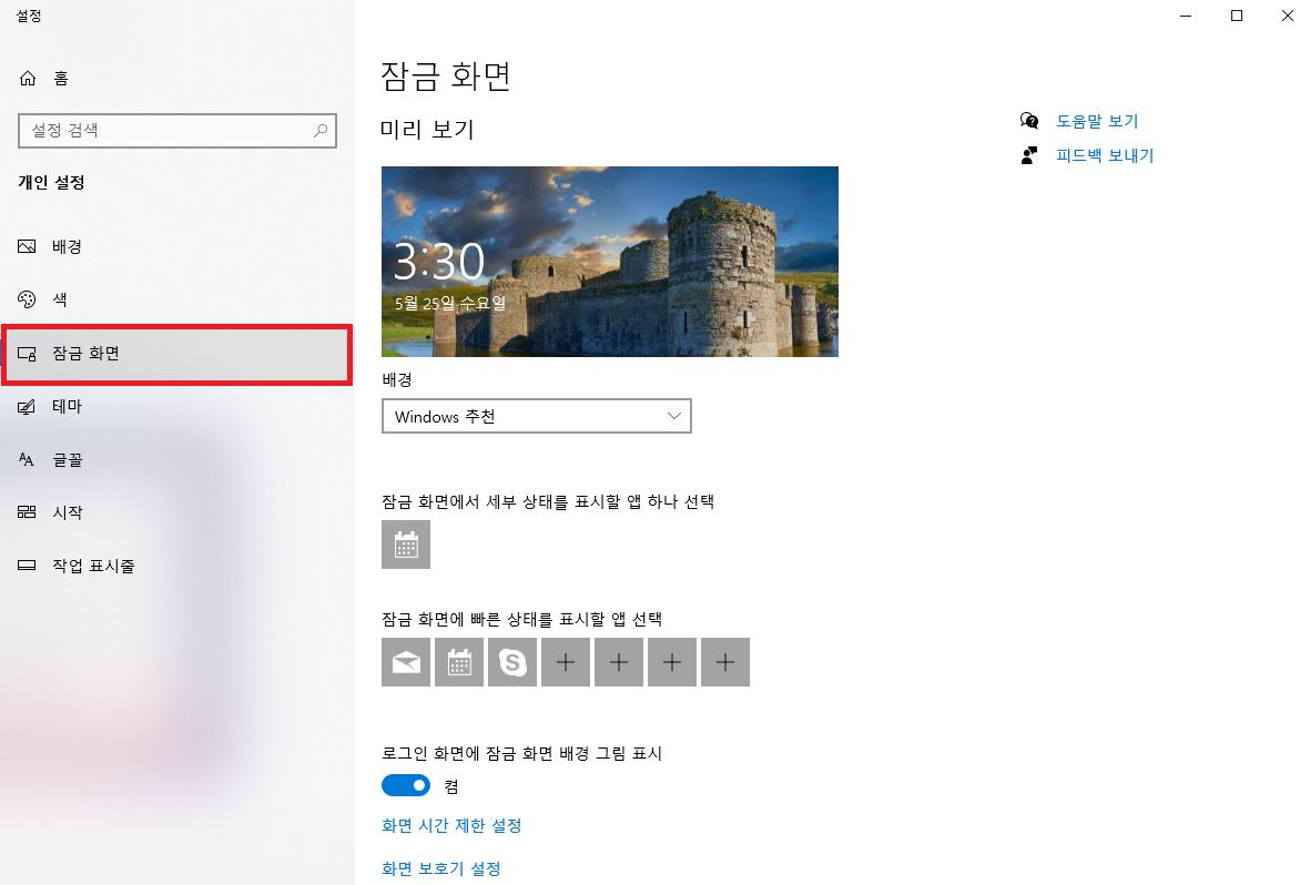 2) 설정 창이 뜨면 좌측 잠금화면 버튼을 누릅니다.