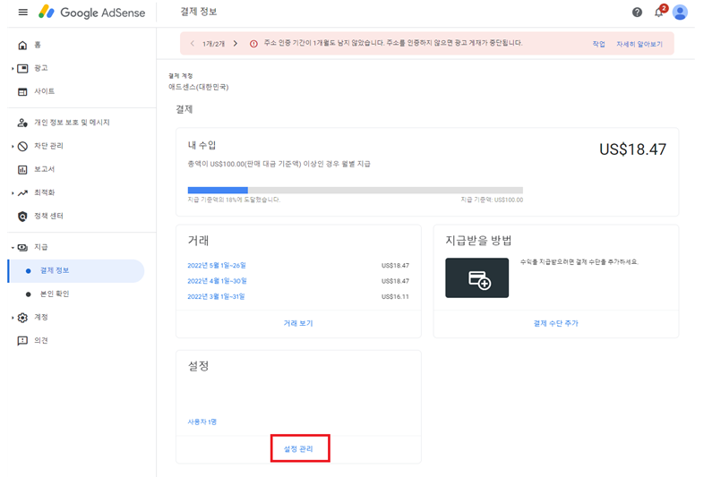 제 수익이 18.47 달러인데.. 100달러가 되어야 수익 출금이 되나보네요..