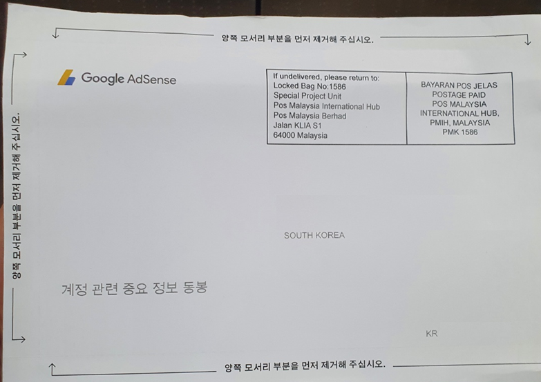 구글 애드센스에 승인 후, 구글에서 입력한 주소로 우편 핀번호를 발송합니다.