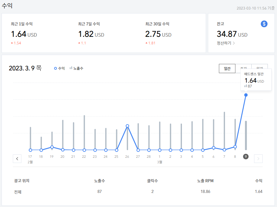 티스토리는 다들 아시겠지만, 구글 애드센스 수입이 가장 큰 메리트이다.