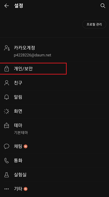 1. 카카오화면에서 우측맨 하단의 ... 을 누르시고 우측 맨 상단의 톱니바퀴 모양의 설정을 누릅니다.